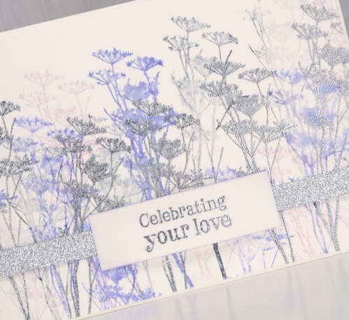 My final card features wildflower silhouettes in blueprint sketch and milled lavender ink stamped repeatedly to get first, second and third generation images as well as silver embossed flowers and sentiments with some very sparkly silver ribbon.