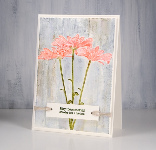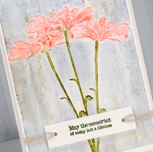 This first wedding card made me think of a country style-decorate the barn type of wedding. I did a bit of masking to get the look of three daisies against a timber background and used twine to keep things natural and not too fancy. I inked the daisy from ‘Tall Flowers‘ set in worn lipstick, abandoned coral, forest moss and peeled paint distress ink, spritzed lightly with water and stamped in centre of a hot pressed watercolour paper panel, then used masks to stamp another on each side. I masked all three daisies so I could stamp the Woodgrain Background Stamp in weathered wood and frayed burlap distress inks.