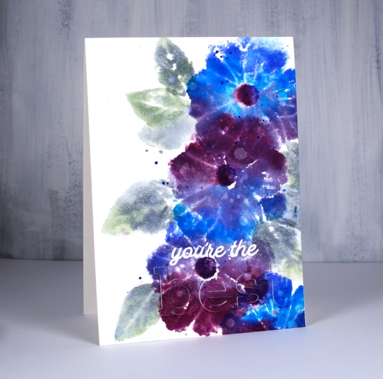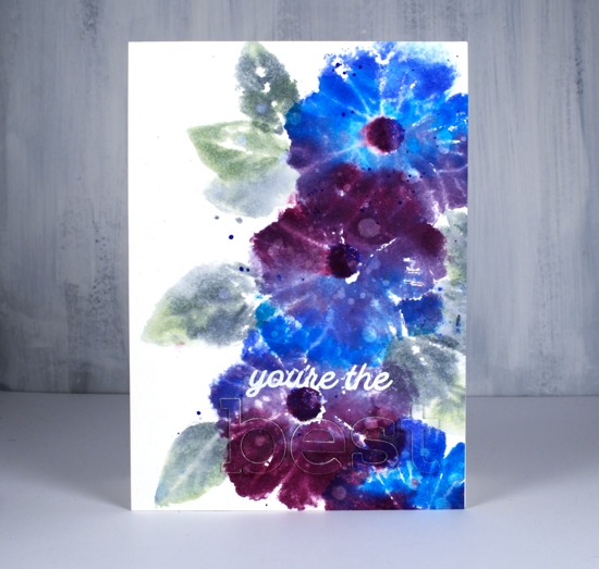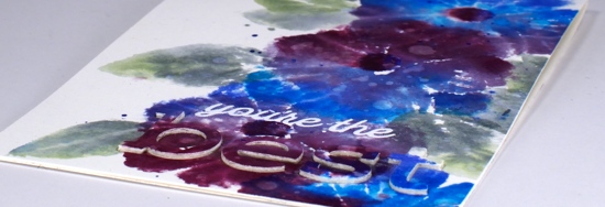 Once all those flowers were done I thought about the sentiment. I know I should consider the sentiment earlier in the process but I rarely do. I didn’t want to cover up too much of the design so I went for the subtle stacked letter die look. I cut the letters b e s t out of the panel and three more of each from blank watercolour paper then stacked them up and attached them on the card. I did some stamp surgery to separate ‘you’re the’ from one of the sentiment stamps in the ‘filled in florals’ set and stamped in versamark ink so I could emboss in white powder. The sentiment is fairly subtle when you look straight on but the recipient will be able to see and feel the texture of the raised letters.