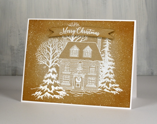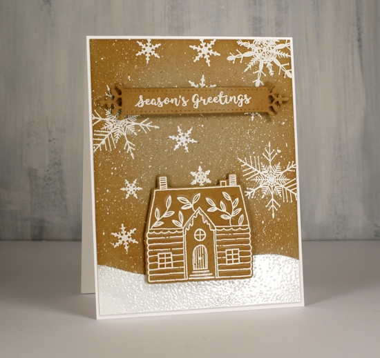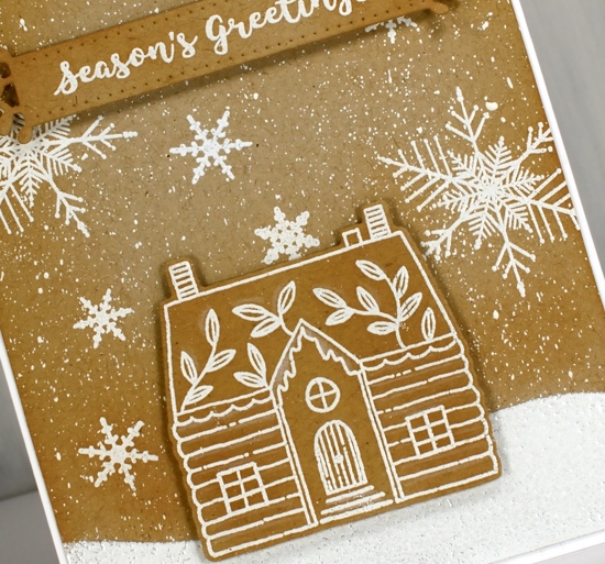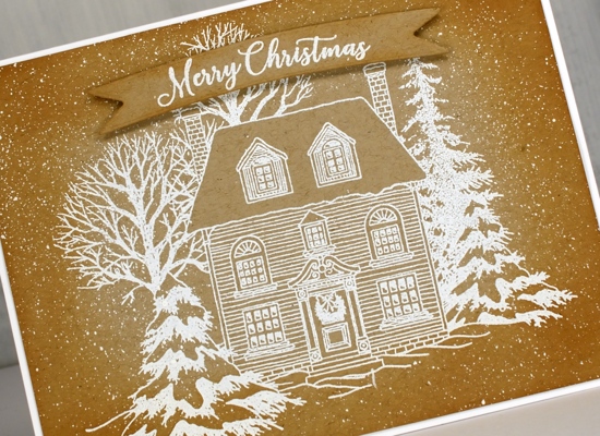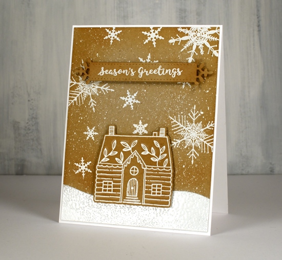 Making gingerbread cards was a bit quicker than the edible version. I used Neenah desert storm kraft cardstock and stamped on it in versamark then embossed with bright white opaque embossing powder. To create the snowy hill I cut a post-it note mask and sponged white delicata ink in a hill shape. The delicata was too delicate, not bold enough for a snow hill so I embossed with more white embossing powder.
