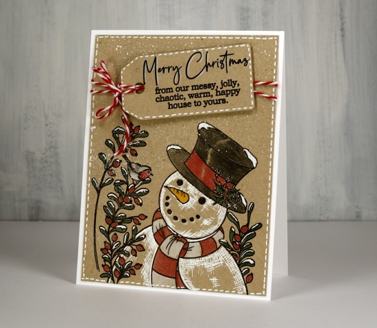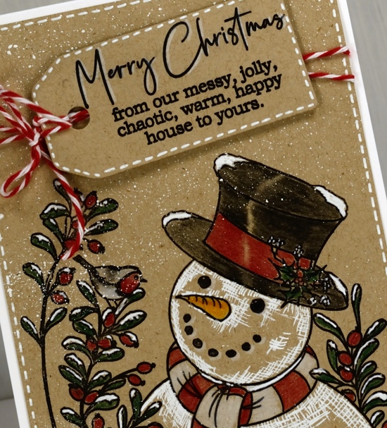Now back to Frosty from the PB ‘Frosty’s Flakes set. I have not created a snowman card in a long, long time but after creating gingerbread on kraft cardstock and poinsettia cards on kraft cardstock (in a recent class) I thought why not try a snowman. I stamped in black this time which looks just as striking on kraft as white does. All the white elements are added with a white gel pen or white pencil.