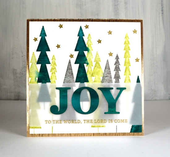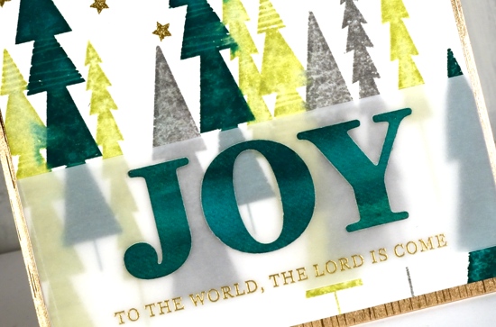 I wanted the die-cut letters to match the trees exactly so I swiped ink across a scrap of watercolour paper then blended it with a wet brush. Once dry I used the ‘season of joy’ dies to cut the word and a stamp from the ‘season of joy’ stamp set to complete the first line of the carol. I used two layers of vellum so the letters and embossed words would stand out from the busy background. I added gold embossed stars and created a textured gold card base from Tonic cinnamon silk specialty cardstock.