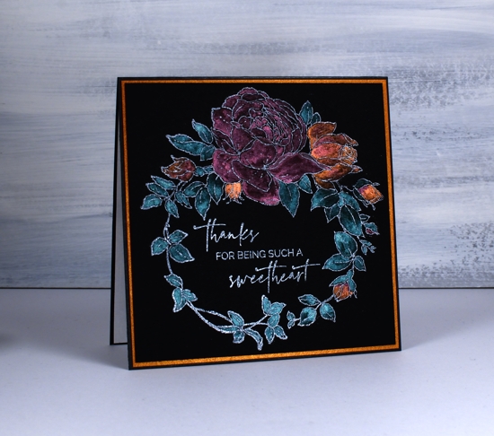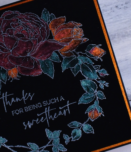 To paint the flowers I used both my Finetec pearlescent paints and pearl paints. I don’t find the two sets all that different but I think there might be a bit more shimmer in the pearlescent ones. I also have some Ken Oliver liquid metals so I used the verdi gris for the leaves above. I carried through the shimmer theme by cutting mats from copper shimmer cardstock and I made card bases from black shimmer and quartz shimmer.