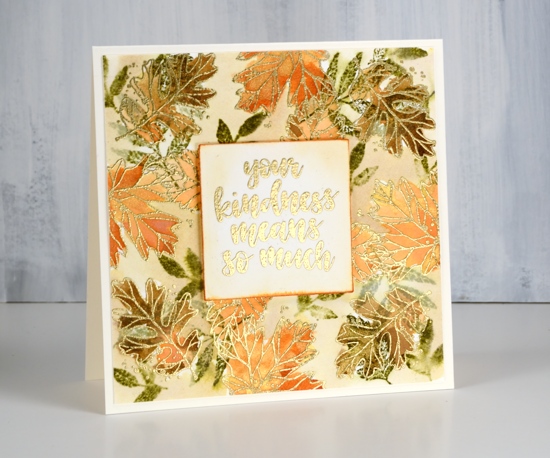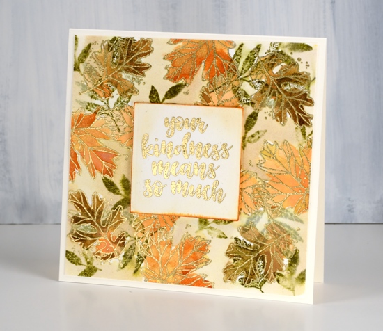Posted: October 3, 2018 Filed under: thankful leaves turnabout | Tags: Concord & 9th, Ranger Distress inks, Ranger Distress stains, WOW embossing powders 16 CommentsIn creating this card I didn’t quite follow the directions properly for a turnabout stamp. I didn’t attach my piece of watercolour paper to a 6’x6″ square of cardstock but my piece was close to 6″ so it wasn’t a waste of paper. (It is worthwhile to watch one of the Concord & 9th videos explaining how the turnabout stamps work. You know, if all else fails read the instructions, ha!) I also chose not to ink all the leaves on the turnabout stamp so as to feature the line images more than the solid ones. I inked the line images in versamark, stamped, rotated the watercolour panel and repeated. Once I had oriented the panel in all four directions I embossed all the line leaves in gold powder. I also inked some of the small leaves in forest moss distress ink. I used distress inks pressed onto my glass mat as paint to fill in all the embossed leaves.