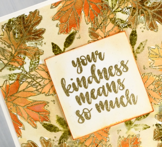 As I hadn’t stamped all the images on the turnabout stamp I had a bit of space between leaves so I loosely painted antique linen distress stain around the leaves. I stamped one of the sentiments included in the set on a square of hot pressed watercolour paper, painted some antique linen around it and dragged the edges across a rusty hinge distress ink pad to frame the panel.