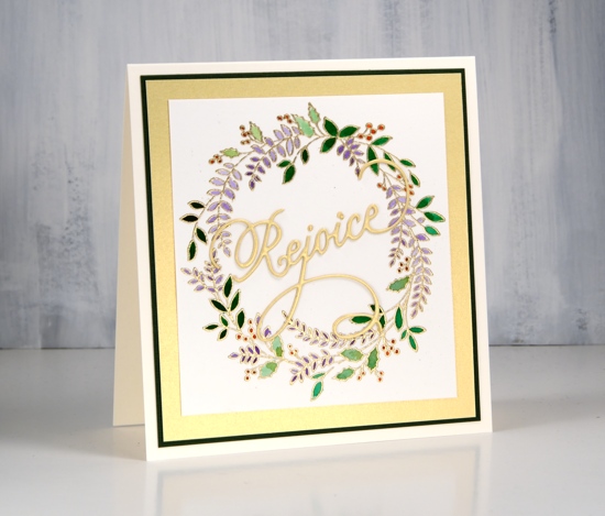 I chose gold cardstock for some stacked die cut sentiments, also from PB, so the sentiment and embossing would co-ordinate. I also matted with gold and green (yes it’s green, not black) cardstock on a cream cardbase.