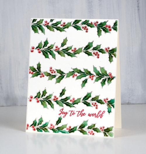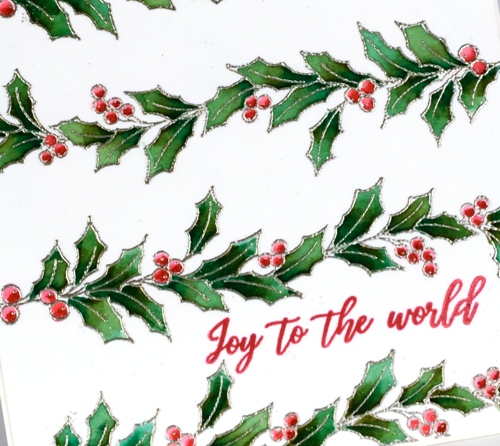 This neat little panel of holly took quite some time to colour, maybe this is why I don’t often paint inside small detailed images. The holly stamp from the PB set ‘garlands’ is embossed in platinum embossing powder then coloured with three zig clean color real brush pens. I coloured the leaves with the olive and the green pen then blended with water. I use a wine pen to colour the berries and also blended them with water for a bit of shadow. I like the finished panel but won’t be doing this style too often!