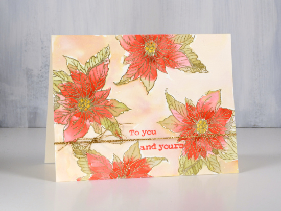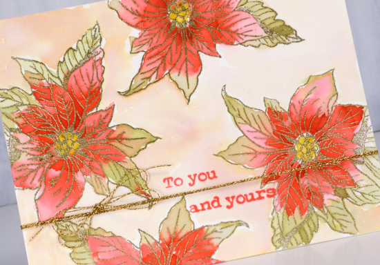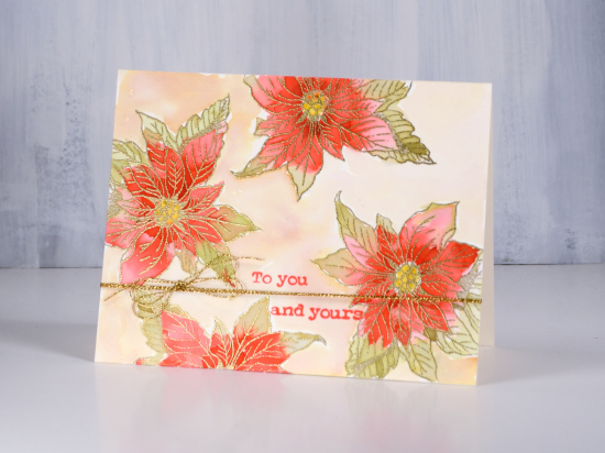 I applied adhesive to a strip of gold cardstock then trimmed it even narrower to position behind the popped up poinsettia. I embossed a sentiment in the same gold embossing powder used for the flower.