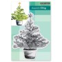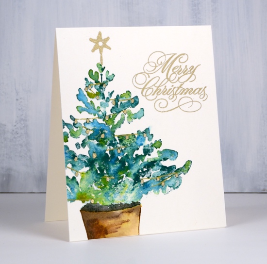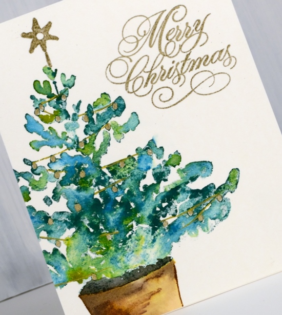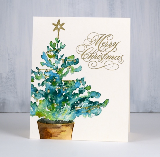 This large tree stamp is called Christmas glow and it is stamped on hot pressed watercolour paper. I coloured it with distress inks while working in a stamp positioning tool. I dabbed different green inks on the tree branches and spritzed lightly before stamping. I wanted to retain the shape of the tree but have the greens blend with each other so I added only enough water to move the ink a little. I stamped the pot in vintage photo then blended with a paint brush then added black soot ink to the inside of the pot.