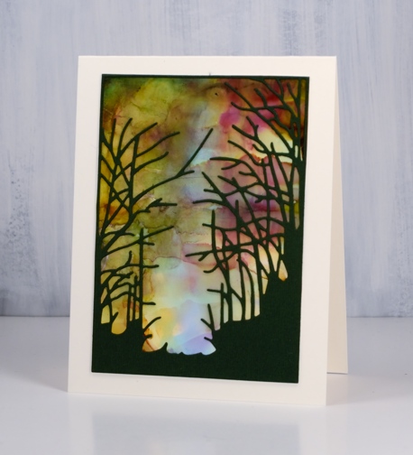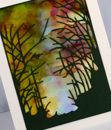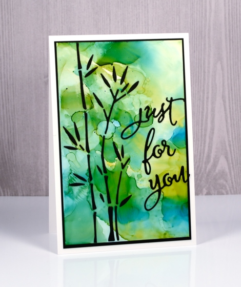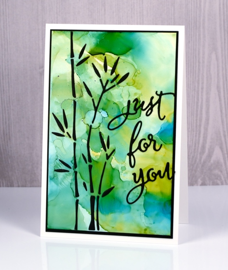 I made the alcohol ink panel on white yupo paper. I dropped some blue and yellow alcohol inks on a craft sheet, added some rubbing alcohol then swiped the yupo through it to pick up the blended coloured patterns. The colours reminded me of light through a forest so I chose the bamboo to be my feature image.