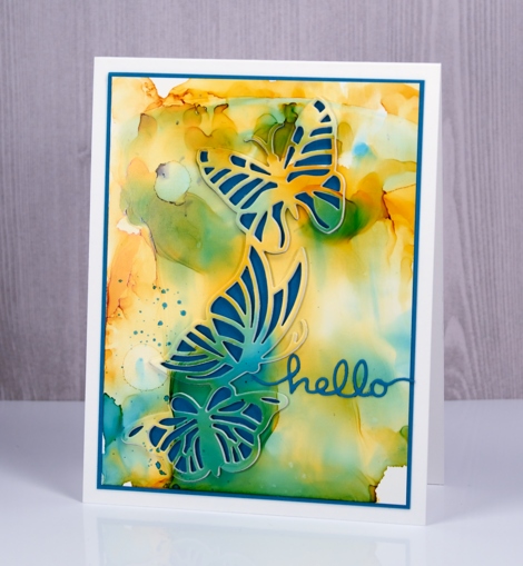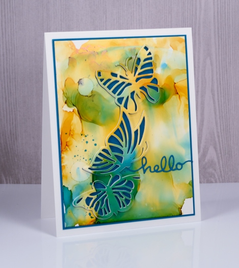 I used alcohol inks on yupo paper to create the background then attached the yupo to white cardstock before die-cutting the butterfly trio from the panel. I also die cut the butterflies from white fun foam so I could pop the trio up out of the background. I did not replace the little die cut shapes in the wings but matted the whole panel in teal instead to create a frame that matched the wings and the sentiment.