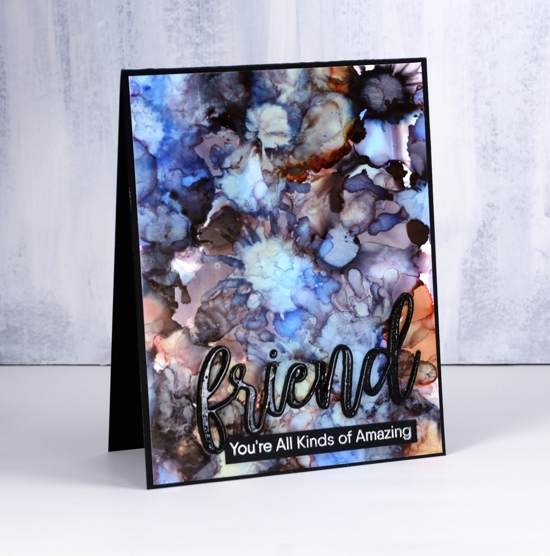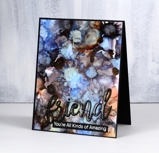 I put double sided adhesive on the back of the black cardstock before die cutting then held all the pieces together with a sheet of ‘press & seal’ so I could attach them to the alcohol ink panel but it was a tad fiddly!