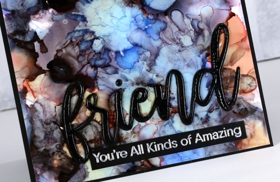 When the panel was dry I trimmed it to fit on a black card base and added a die cut sentiment and an embossed sentiment both from My Favorite Things. The word die (from the ‘friend duo’ set) I cut from black foam and black cardstock. Before I attached them to the panel I embossed the black cardstock word in clear powder to give it a shiny surface. I glued the foam down first, then the embossed cardstock ‘friend’ on top. I embossed a phrase from the MFT ‘Anything but basic Friendship’ set in gun metal embossing powder – a new colour from Ranger.