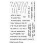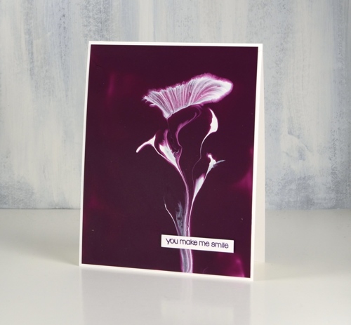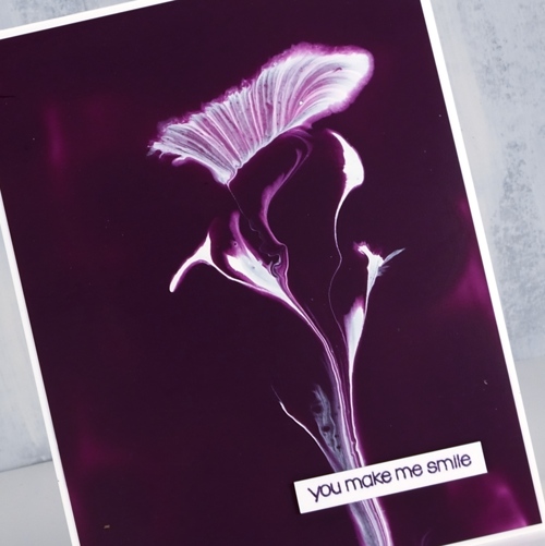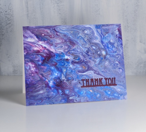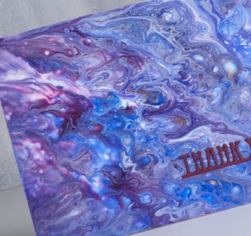This second panel is a ‘dirty pour’ created when several colours are poured into a cup together, cup is turned upside down onto the yupo panel then lifted to let the paint escape in all directions. A little tilting this way and that can change the size and shape of the pattern but really I didn’t do much; the magic just happened. I also didn’t do much to turn the panels into cards, a tiny sentiment stamped in monarch versafine clair ink on the top card and a stacked die-cut sentiment on the second card.
