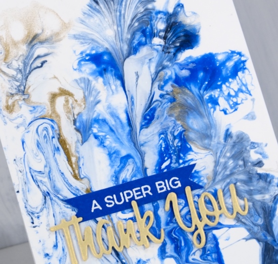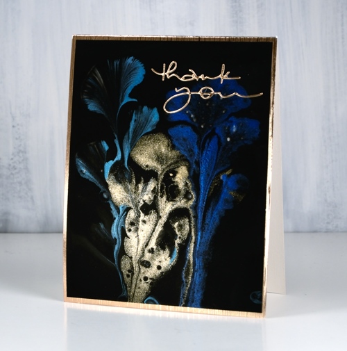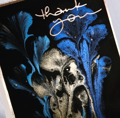 Posted: December 11, 2018 Filed under: Dies, paint pouring | Tags: paint pouring, Penny Black creative dies, Yupo Paper 9 CommentsYes, I have more from my paint pouring adventure to share! This one was done with metallic paints as you can see. When you pour or in this case ‘drag’ them onto the base colour the metallics don’t look very shiny but as they dry, well, you can see how lovely they are. To turn this one into a card I searched through my gold cardstock to find a match with the gold paint. I am a bit fussy with gold cardstock, some is too coppery, some too brown, too yellow, too light, too dark; you get the idea. The one that matched the best this time is a textured gold made by Tonic and it has a white back so I turned it into the card base. I also die-cut a ‘thank you’ from the same cardstock.