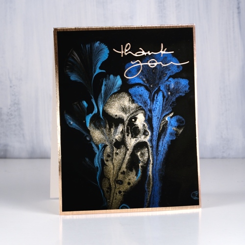 I did several pours on heavy yupo and a couple of little canvases. They take a while to dry so I have turned only one into a card so far. I won’t go into detail about the technique or supplies; I’m too much of a newbie. If you want to learn about paint pouring then look up Myriam’s Nature on youtube and prepare to give up the rest of your day being mesmerized by her beautiful panels. My base for this design was white paint then I dipped threads into blue paint and gold paint and dragged them across the panel to create these pretty patterns.