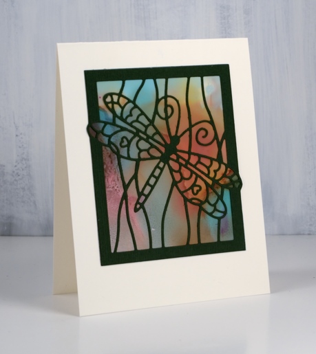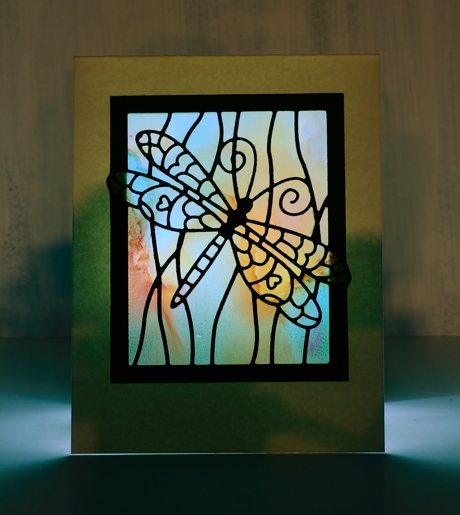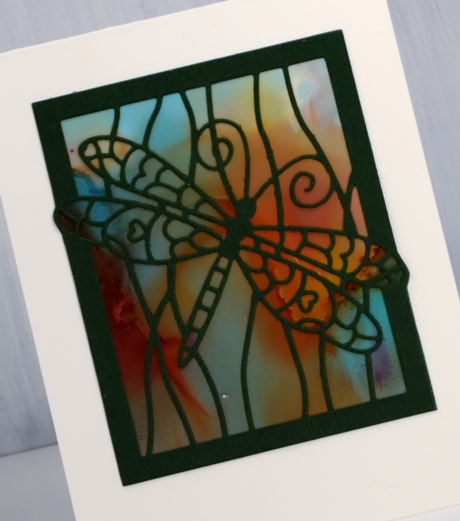 I was able to get very soft blends by adding rubbing alcohol and tilting the yupo around. This panel was done on light weight yupo which is translucent. When I held it up to the light the colours softened and looked like stained glass. I decided I had to cut the cardstock out behind the dragonfly ‘window’ so a light could be placed under the card to show off its soft blended colour. Not a real tealight mind you, remember this is paper crafting! I took a photo to give you an idea of the pretty stained glass effect you see with a soft light underneath.