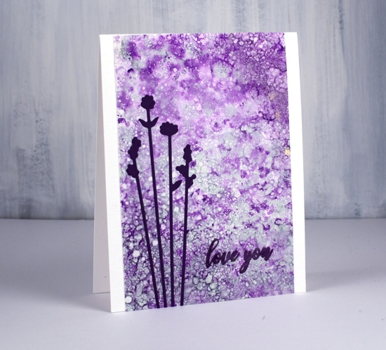 Posted: October 2, 2019 Filed under: Alcohol Ink, Penny Black, simple serif alphabet dies, tall flowers | Tags: Concord & 9th, grafix craft plastic, Penny Black creative dies, Penny Black stamps, pinata alcohol ink, Ranger Alcohol Ink, Yupo Paper 11 CommentsLast weekend I spent Saturday creating with alcohol inks while learning from Kathryn Kanadian who was in Ottawa teaching a couple of classes. Kathryn is a wonderful teacher and I now have a few new tricks to try and techniques to practice. This lavender panel was created with dots of ink on an applicator; I used passion purple, rich gold (Pinata) and juniper (Ranger) along with some blending solution or isopropyl alcohol. I dabbed the applicator all over the craft plastic for quite a while and added blending solution and more ink when needed. The gold ink didn’t move much but the other two colours created a lot of pattern. These delicate flowers which look a little like lavender are cut with PB ‘tall flowers’ dies. The sentiment from the PB ‘special sentiments’ set I stamped with dusty concord archival ink. I had a section of the patterned panel left over so I was able to die cut some more flowers to pop inside the card. You can be sure I put stick-it adhesive on those panels before I cut such skinny flowers out.