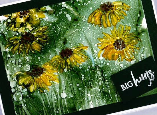 I began by creating a green background with the help of some isopropyl alcohol and green ink (not sure if it was meadow or pesto??) I used a stylus to dot the centres of the flowers in copper and pitch alcohol inks (Ranger) then I used a brush to paint petals around the centres and stems and grass at the base. The splatters of isopropyl alcohol pulled the composition together.