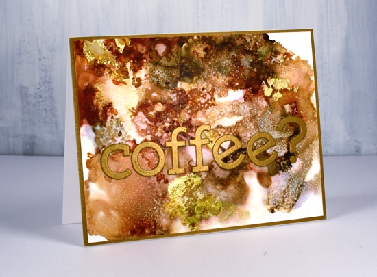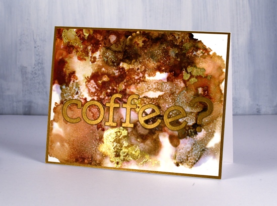 The panel of browns and gold below came together as Kathryn was encouraging us to experiment with blending solution to move the ink. I used more than I usually would and was delighted with all the variation of colour I achieved, the dotted patterns and the splotches of gold here and there. I used ginger, espresso (Ranger) and rich gold (Pinata). Kathryn had samples of her wonderful work including a coffee themed card that inspired this one.